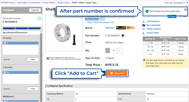 • *The ''Add to Cart'' icon will be displayed after the part number is confirmed.