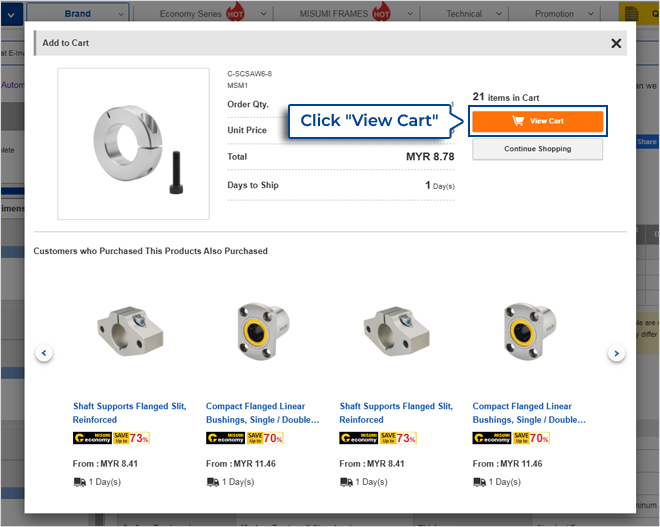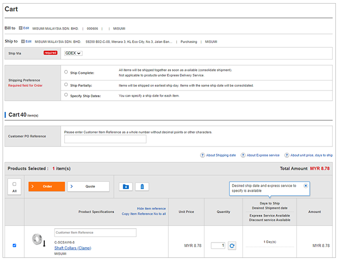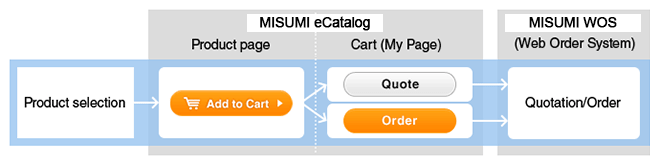 On the cart page, you can send wish-listed products to the MISUMI WOS (Web Ordering System)and place quotation requests and orders for the products via the WOS. If you want to check a product for which you placed a quotation request/an order, click Order History or Quotation History