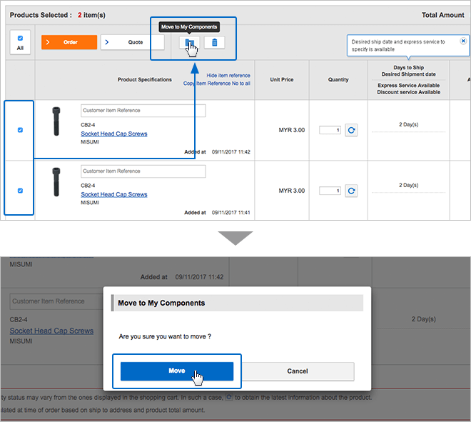 - Select (tick) the products you would like to move to ''My Components'' and click on icon to open the confirmation dialog box.