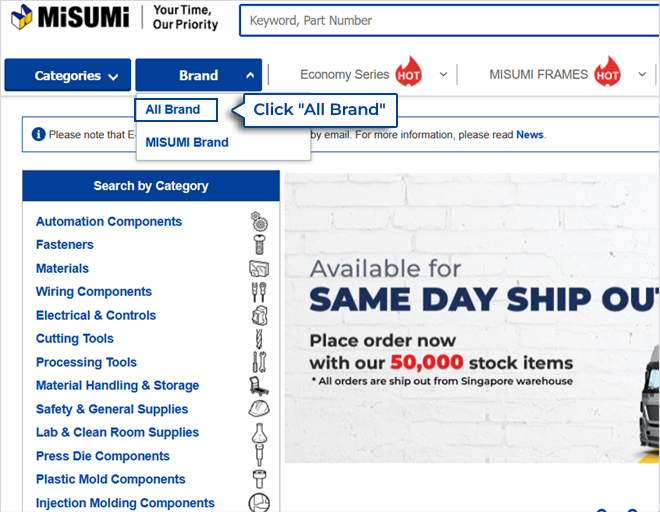 Go to the "Brand" menu located in the header of the site and select "All Brand" to view all available brands.