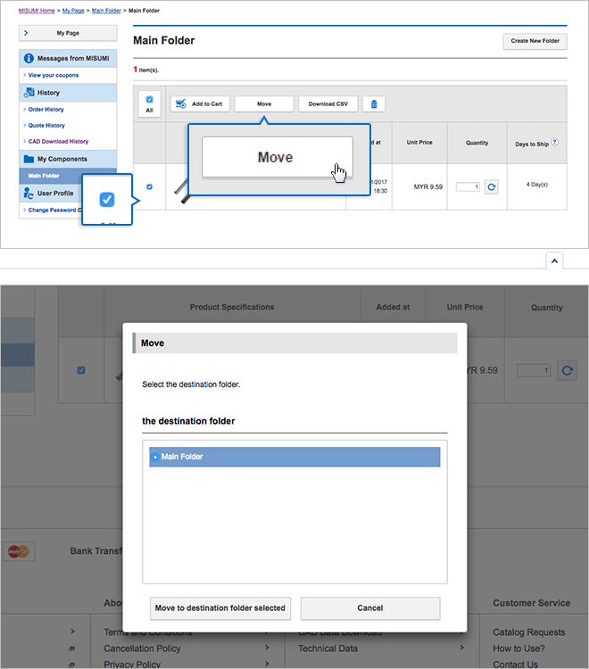 "My Components" allows you to save product information, such as part numbers, folders and manage the saved information folder by folder.
