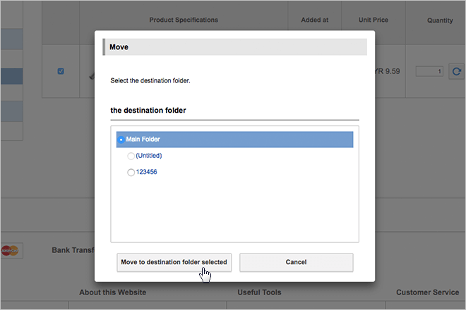 1. From the product list, select the product to be moved. 2. Click on ''Move''. 3. Select the destination folder and click on ''Move to destination folder selected''.