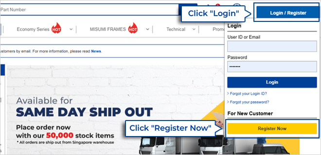 Click on "Login/Register" on the top right of MISUMI main website.
