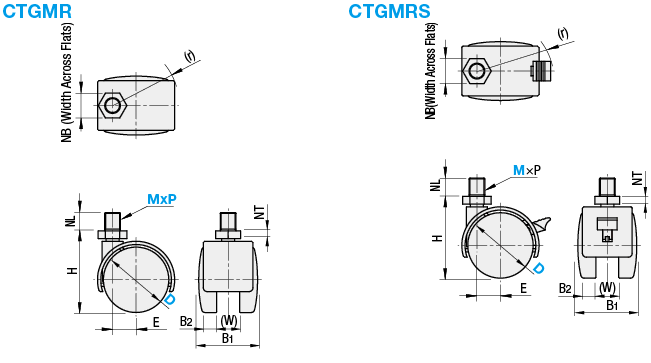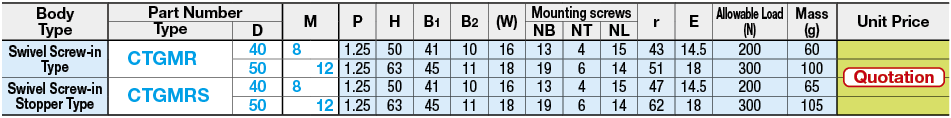 | Part Number | Standard Unit Price | Minimum order quantity | Volume Discount | Days to Ship | Mounting Height H (mm) | Stopper (Detail) | Allowable Load (daN) | Wheel Dia. D (Ø) | Wheel Width B (mm) |