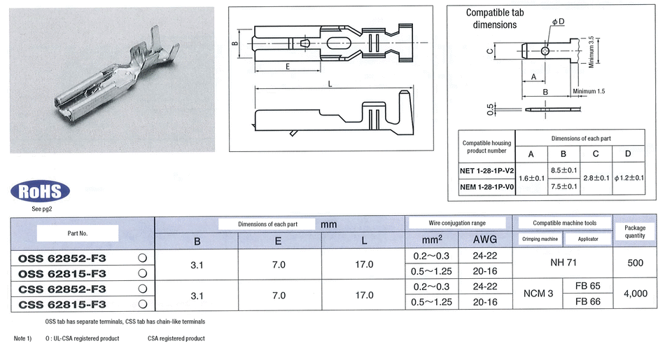 Please check the type/dimensions/specifications of the part OSS62852-F3 in the Easy Lock Connector 110 Series Conforming Terminal series.