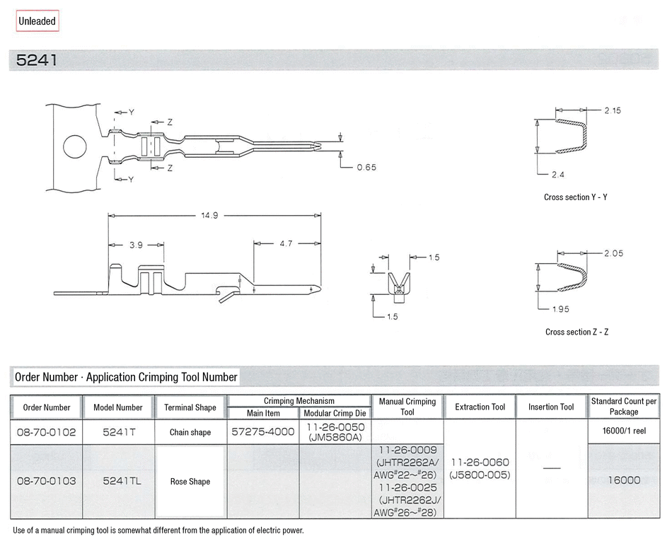 | Conforming housing | 5240 | Applicable size AWG | 22 to 28 | Terminal shape | Individual |